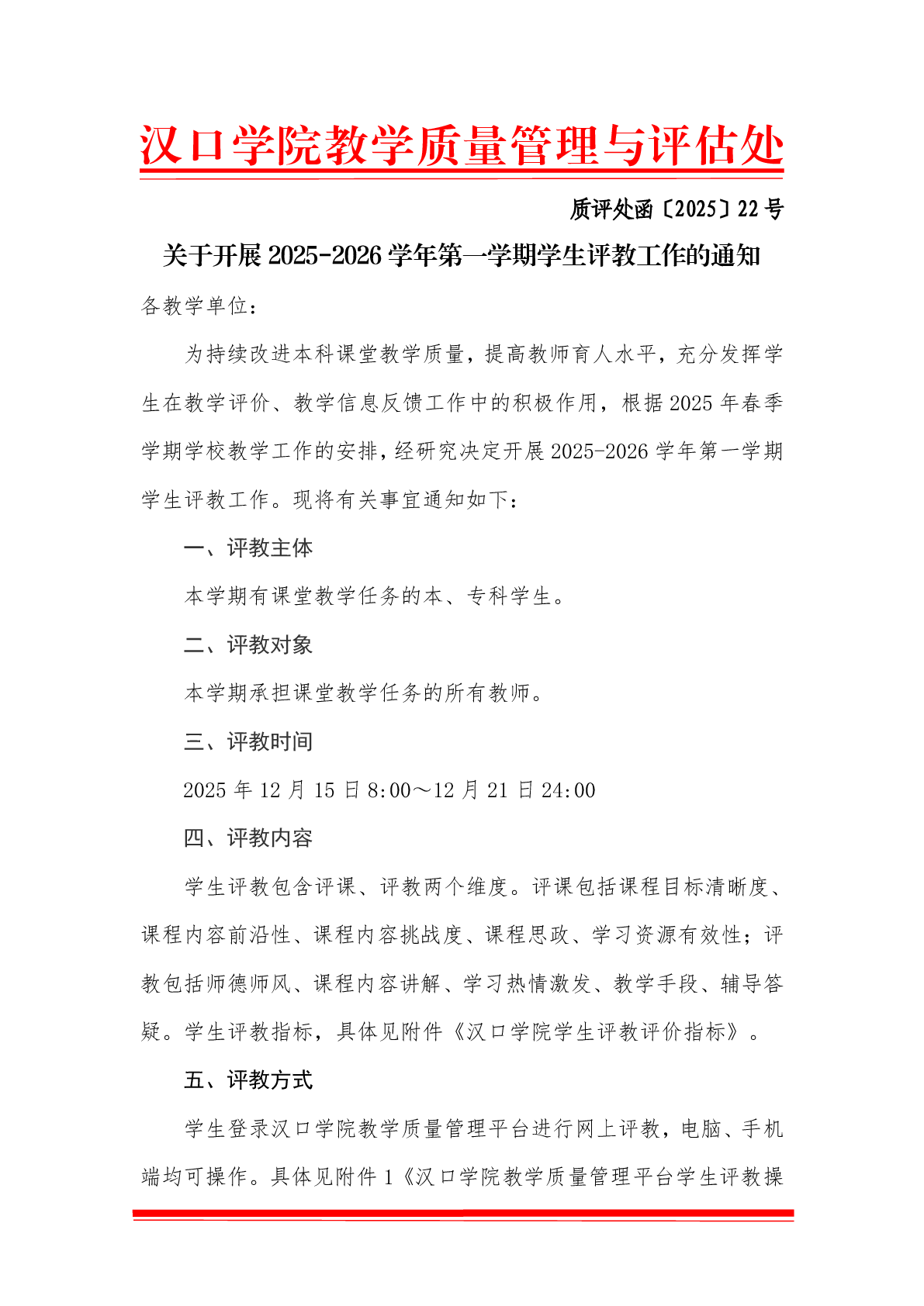 关于开展2025-2026学年第一学期学生评教工作的通知
